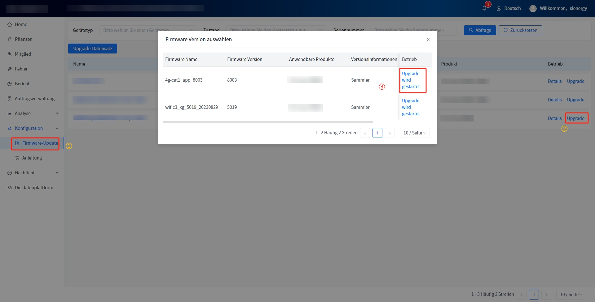 Wenn Ihre Kraftwerksausrüstung bereits mit dem Netzwerk verbunden ist, unterstützt dieses System Sie, ein bestimmtes Gerät in Ihrem Kraftwerk aus der Ferne zu aktualisieren.