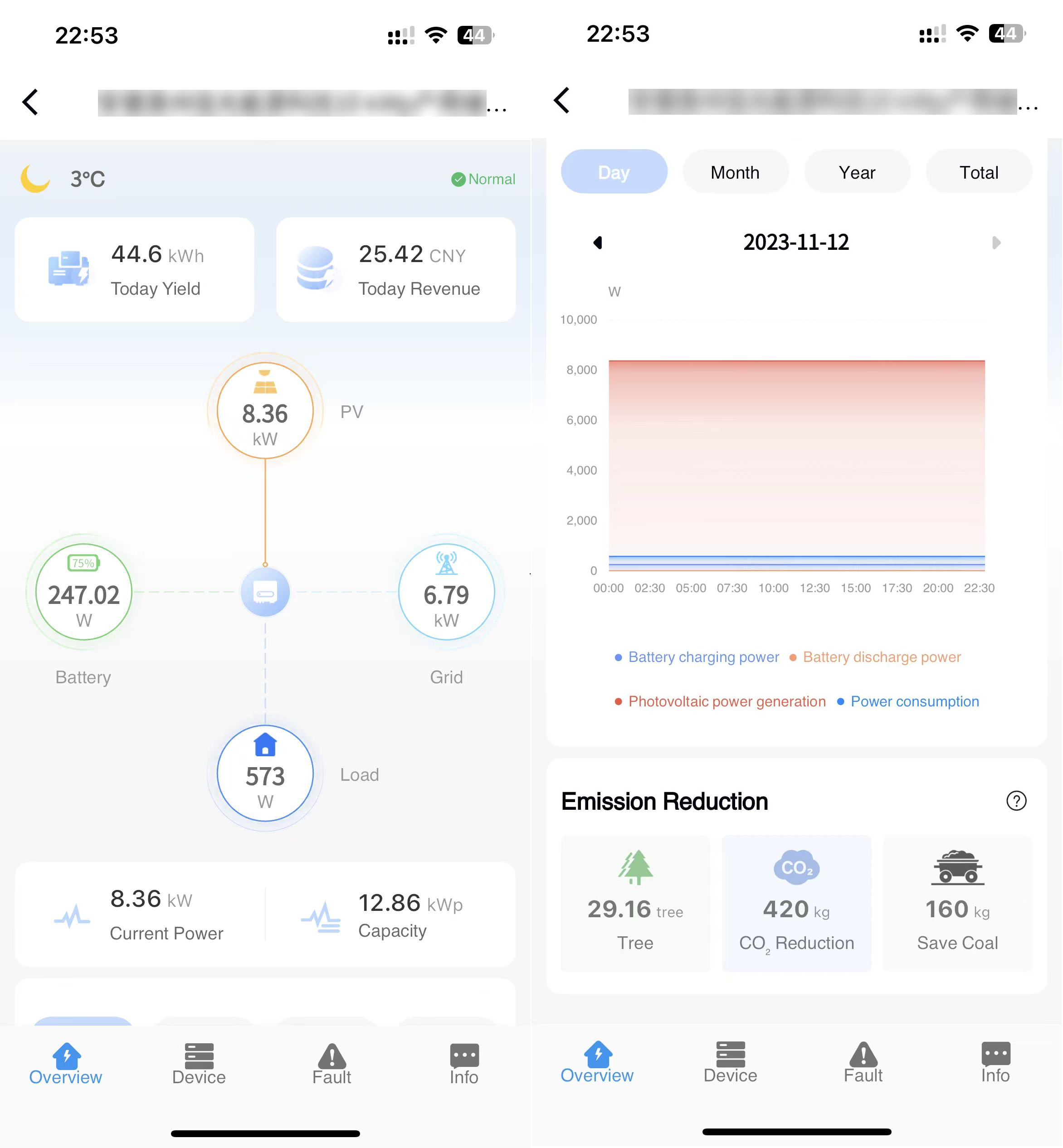 The APP supports viewing the real-time information data of the equipment in the details of the power station; You can view fault details and fault causes in device details. You can view the statistics of the device.