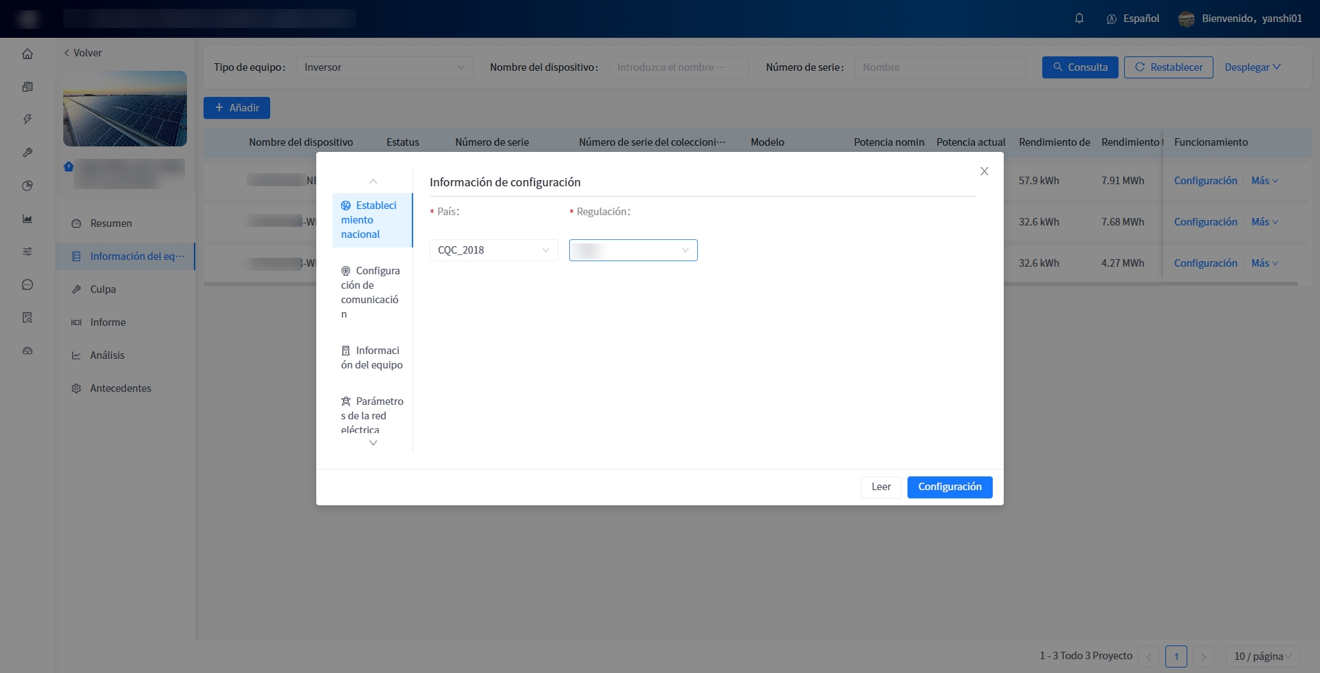 Este sistema admite la visualización de datos de información individual de la central eléctrica, información del equipo, información de fallas, estadísticas de informes y análisis de curvas. Puede acceder a la página de resumen de la central eléctrica de los detalles de la central haciendo clic en el nombre de la central.