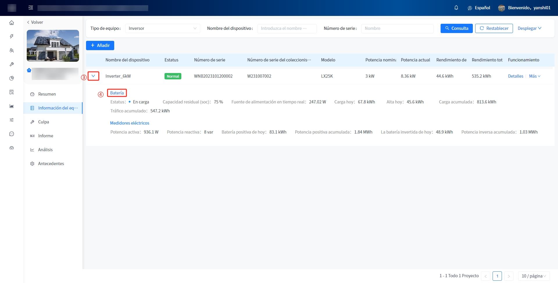 [situación de generación de energía] muestra la potencia fotovoltaica de la planta, la potencia eléctrica consumida y la potencia de carga y descarga de la batería. Mensual, anual y acumulativo muestra los datos correspondientes de la electricidad.