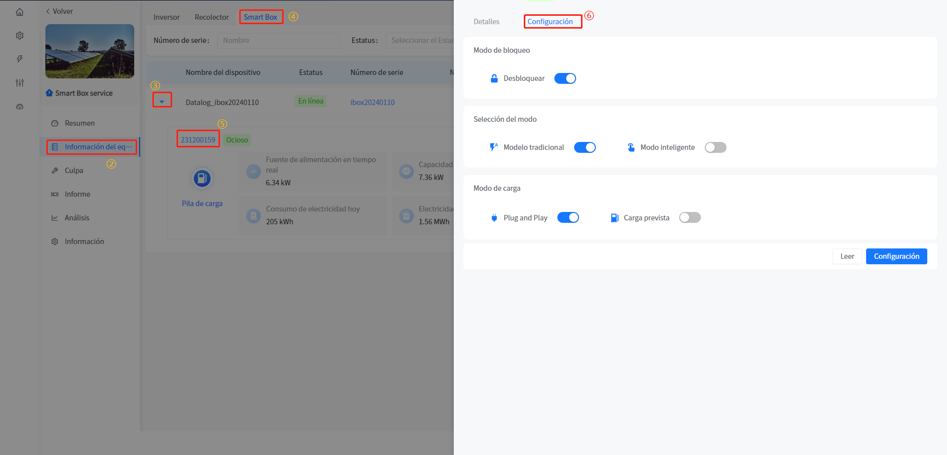[carga eléctrica] muestra la potencia eléctrica de la estación, el consumo del día, el consumo del mes, el consumo del año y el consumo acumulado.