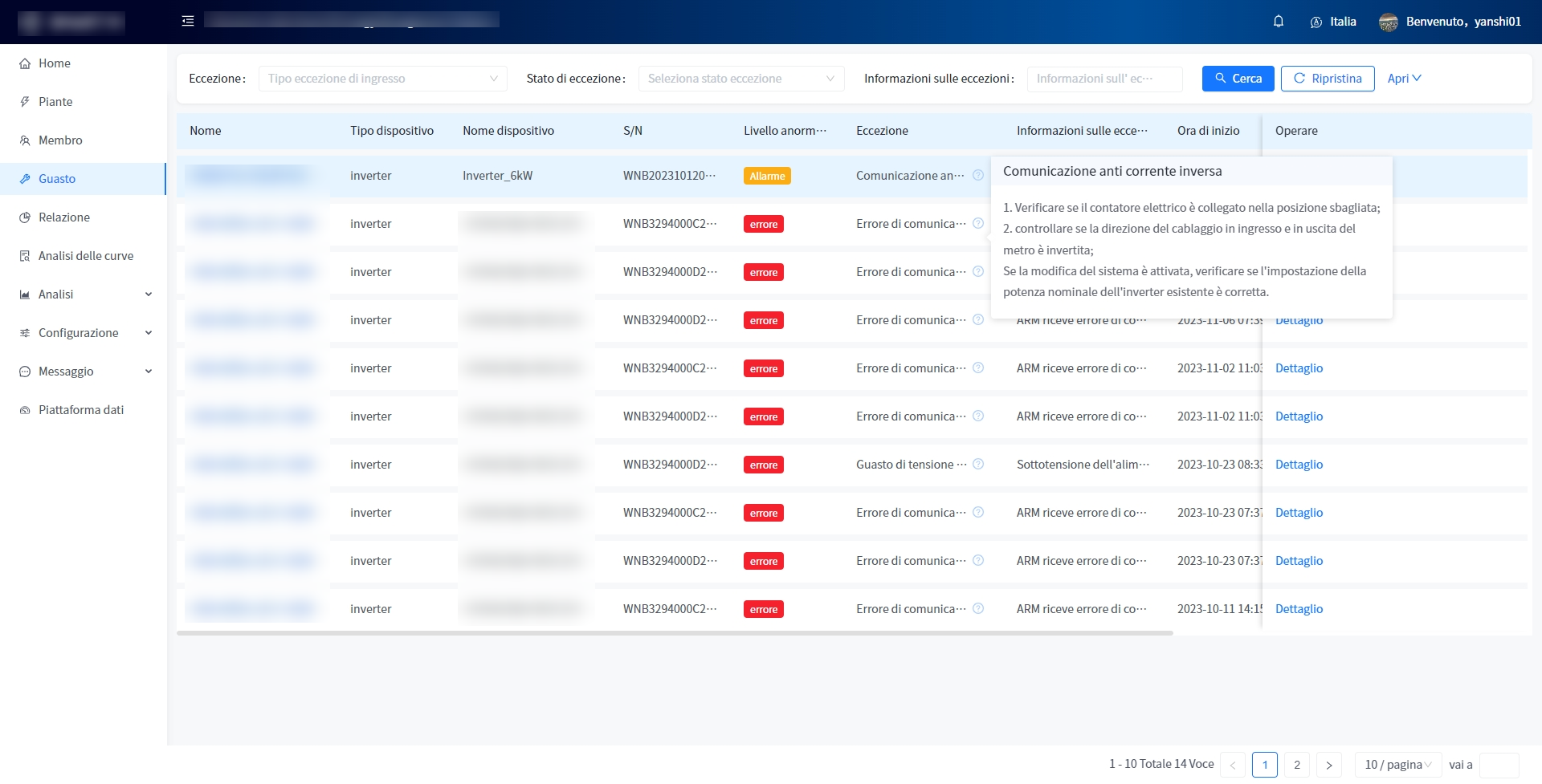 Questo sistema fornisce potenti funzioni intelligenti di monitoraggio e elaborazione dei guasti. In grado di identificare automaticamente i codici di guasto dell'apparecchiatura e generare le corrispondenti informazioni di guasto basate sui codici di guasto; Una volta che l'apparecchiatura non funziona correttamente, quando il sistema riceve il codice di errore, genererà rapidamente un messaggio di errore e informerà il proprietario della centrale elettrica e gli utenti attraverso più canali; Questo sistema ha una potente funzione di prompt dei guasti, fornendo le cause possibili corrispondenti e suggerimenti di gestione per i diversi tipi di guasti. Può aiutare il personale operativo e di manutenzione a individuare rapidamente i guasti delle apparecchiature, risolvere i problemi e ridurre i tempi di inattività delle apparecchiature; La cronologia completa dei guasti dell'apparecchiatura viene salvata dal sistema sin dalla creazione della centrale elettrica, che può aiutare a tracciare e interrogare la situazione di guasto dell'apparecchiatura in qualsiasi momento.